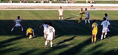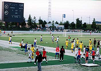 うだるような暑さの中を新幹線、東海道本線、名鉄線を乗り継いで到着した刈谷市総合公園多目的競技場は改修工事の中ほど。外観は小ぶりながらもきれいにまとまった印象で、照明灯も6基、簡素な電光板もあり。しかし観客席はメイン側のみ。バックとゴール裏は狭い芝生の通路で、観戦は可能なれど低い位置なのでフィールド全体を見渡すには不都合。おまけに夏の西日はまだ高く、バック側では真正面から浴びる格好になります。よってサポート隊が陣取ったのはメインの右側前列。肝心なフィールドに目を移すと、本来陸上競技のトラックがある部分は工事中で土台となる層がむき出しになったまま。インフィールド…つまり試合が行われる芝生の部分も芝の密度がやや低く、多少デコボコもありそうな感じでした。この競技場での最高動員記録は昨年のブランメル仙台戦での2100人。ちなみにコンサ戦は360人でした。きょうはメインスタンドはほぼ満席。公式発表は1667人。昨年の4.5倍です! デンソーサッカー部の歴史が昭和24年(!)の創部以来半世紀近くに渡り、前述のような大学サッカー等の大会が頻繁に開かれていたこともあって、刈谷市サッカー協会のみなさんの会場運営もテキパキとしたもの。スタンドには子供たちの姿も目立ち、ここがサッカーの街としての顔も持っているのだということをさりげなく感じさせてくれたのでした。