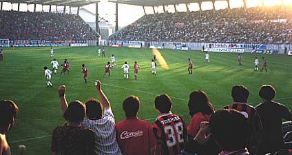 カシマの落陽:茨城県立カシマサッカースタジアム。コンサ・サポが「隔離」されたのは、アウェイ側ゴール裏のほんの一角。ピッチでは今季初めての屈辱的な試合が・・・。逆光なので、画面中央に夕陽が写り込んでいます。 (写真&コメント:横浜の渡辺さん)