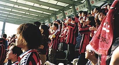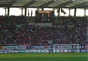 鹿島との対戦が決まった段階からコンササポが懸念していたのがJリーグでも1、2を争う熱狂的な鹿サポの存在。およびカシマスタジアムでのアウェイチケットの入手についてでした。後者については各自の電話予約攻勢やOSCを通じて希望者はほとんど手に入れられたようです。一説によるとホームからいらした方は約150人とか。横浜在住の筆者にとっても片道4時間くらいかかりますから、アウェイみたいなものなのですがね(苦笑)。それから「ツアー」のバスは途中の渋滞で大幅に遅れ、危うくキックオフに間に合わないところでした。間一髪でしたね。