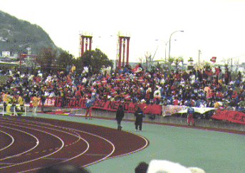 試合会場の室蘭入江競技場には、開始1時間前の12時頃つきました。寒い、とにかく寒い。後で新聞などで確認したところ、この日の気温は結局、6度くらい。札幌から来た私は、室蘭は札幌より暖かいだろうと思っていましたが、これが大間違い。試合は鼻水すすりながらの観戦となりました。