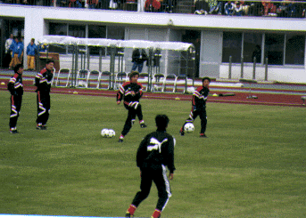 テレビ中継も入ったこの試合(北海道での視聴率6.8%)、中継の入る前の会場の様子から説明しましょう。到着した12時頃には、向かって左側のゴール裏芝生席で、応援団の人が既に大声を出して応援をはじめておりました。初め50人くらいだったのが、リーダーの人達がバックスタンドまで行って、いっしょに応援しませんかと声をかけた所為もあって最終的には150人くらいになりました。この日、EVEなどのサポータークラブの人達の他に、浦和と清水の北海道支部の助っ人の応援団もたち、結構派手に応援していました。ちっちゃな子供たちも混じっていて、ほほえましかったです。私も取り合えず、その集団の右の方に座り込み観戦と相成りました。会場は結構人が埋まっていて、おっ、これは満員になるか?という感じでした。結局、最終的には6072人が来場したそうです。見た目、8割くらい埋まっていたような感じがしたのはひいき目だったんだろうか?。12時半になると、両チームの選手の紹介が大分の選手からアナウンスされましたが、今一聞き取りにくかったです。それでも、新加入の金が45番ということはわかりました。この頃から選手がでてきて、メインスタンド下で準備体操をはじめました。12時50分には、堀北海道知事の挨拶までありましたが、やっぱりマイクの音は聞き取りづらく何を言っているのか今一でした。そうこうしているうちに、1時になり試合開始です。