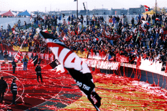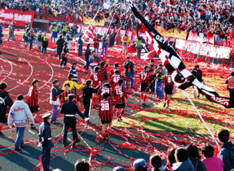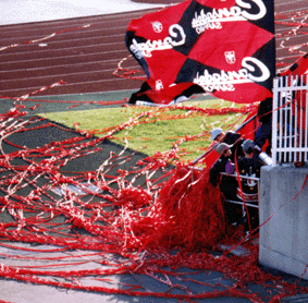 小話1996 富士通戦後の赤紙テープ5300本によるフィナーレ 1996年10月27日 コンサデコンサ管理人 この日、JFL最終節対富士通川崎戦終了後、ゴール裏サポーターズオフィシャルクラブ(OSC)連合が計画した「赤紙テープ5300本企画」が行われました。この一年を締めくくる企画となりました。準備が大変だったそうですが、ご苦労さまでした。 ゴール裏の赤紙テープ この試合、最終節ということもあり、寒い中7900人の観客が集まった。試合終了後、スタンド、ゴール裏席から5300本もの赤紙テープが投げ込まれ、フィナーレを飾りました。 手を振る選手達 赤紙テープのなかを、試合終了後、場内を一周する選手達が、この一年応援してくれたファンのみんなに手を振りながら歩きます。 宴のあと 厚別競技場のワンシーン。来年もみなさん、がん張りましょう。 記事の共有: