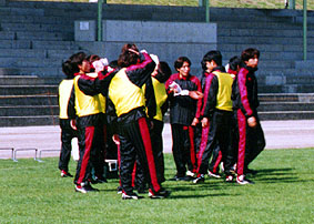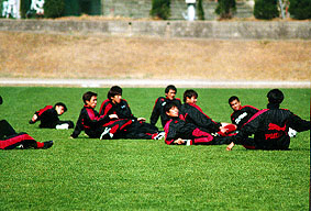 [ストレッチ運動をする選手達]:練習前には、必ずストレッチ運動を行います。昔、準備体操と呼ばれていたものに変わるものですが、厳密には違うものです。ストレッチ運動は、体の筋肉などをあらかじめのばしておくことによって、筋肉の可動範囲を大きくし、練習中の激しいプレーなどで筋肉に無理な力が加わったときに、けがをしたりするのを防ぎます(stretch:伸ばすという意味から来ています)。筋肉の伸ばし方も、無理に力を加えて伸ばすのではなく、ゆっくりゆっくり無理をせず伸ばします。