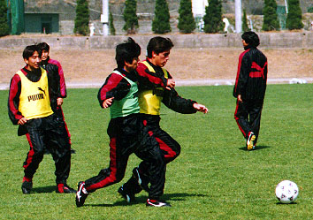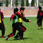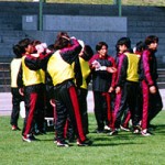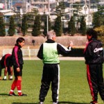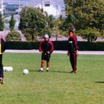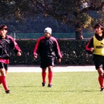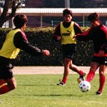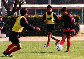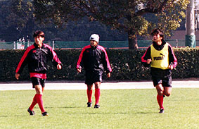 [練習風景]:フォーメーション練習中の選手達。左から、後藤義一、マラドーナ、太田貴光の各選手。