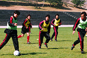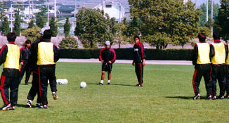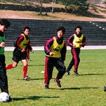 [練習風景]:フォーメーション練習中の選手達。左から、新村泰彦、?、土田哲也、?、ペレイラの各選手。
