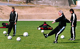 [FKの練習]:ペナルティエリア前でのフリーキック(FK)の練習風景です。直接ゴールをねらう、マラドーナ選手(中央左)とペレイラ選手(中央右)と、ちょっと見えにくいですが後藤義一選手(左側壁の選手の間からこっちを向いている)。