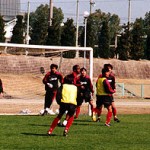 [ゴール前の攻防]:フォーメーション練習中の選手達。ゴール前での攻防です。ちょっと込んでいてわかりにくいですが、中央バルデス選手。キーパー赤池保幸選手(中央やや左手袋をしている)