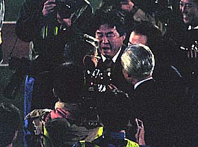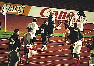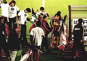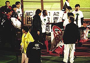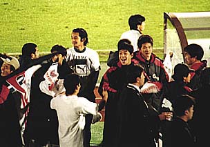 メインスタンド下のピッチの上で、歓び合うHFCフロントの人達。こちらを向いているのが、石水-石屋製菓社長、その隣りに今井-丸井今井社長、向こう向きで髪の白い方が、お祝いを述べる堀-北海道知事、その左隣りには、同じくお祝いに駆けつけた桂-札幌市市長の姿も見えます。石水社長は、男泣きに泣いておられました。