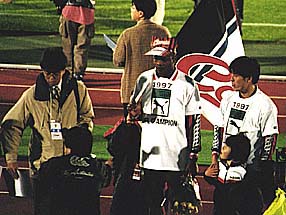 みんなで記念撮影。横断幕には、『97JFL優勝、Consadole Sapporo』と書いてあります。