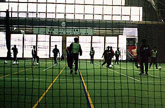 練習している様子。三笠ドームの下は人工芝、大きさはテニスコート三面?か四面?分ほど。正規のサッカーフィールドより小さいため、試合勘が鈍るといった意見もありました。