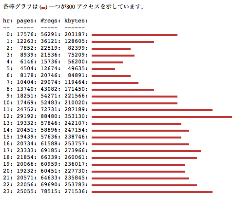 さすがに深夜には、アクセスする人は激減します。でも、これらの時間帯には自動巡回ソフト、あるいはプロキシーサーバーからのアクセスが多いのが特徴で、一回に1000ファイル以上アクセスしたりしているマシンがログに残っていたりします。
