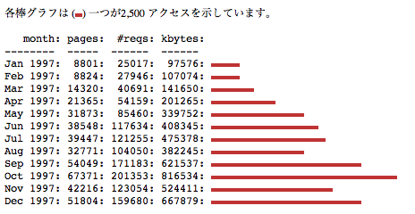 第2話は、97年1年間にわたってのこのホームページへのアクセス状況を、紹介します。この一年間でどれくらいの人がアクセスしたのか?、どのコンテンツに人気があたのか?などが、わかります。まず最初に、昨年一年間のこのホームページへの全般的なアクセス状況を示します。