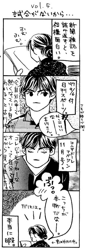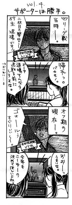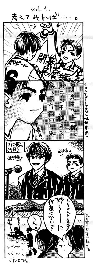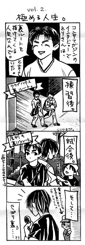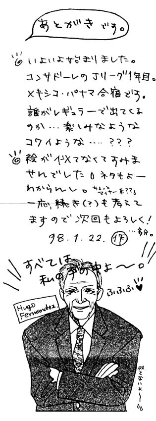 小話1998 Monthly Comic We Love Consadole No. 1 1998年1月22日 コンサデコンサ管理人 サポーターAさんが、制作していたミニコミック『We Love Consadole』です。このコミック誌、毎号何編かの四コママンガで構成されていました。サポーターAさんの許可をいただいて、その一部をここに掲載しています。 <Monthly Comic We Love Consadole No. 1> STORY & COMIC by ゴールうら漫才コンビ ………の片割れA PLANNING & PRINTED by 札幌鳥居塚同盟+札幌スイーパーマニア 記事の共有: