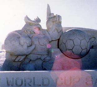 コンサドーレが、札幌にできてから2年がたちました。今年は、コンサドーレのJFL優勝&J昇格。そして日本代表のW杯フランス大会出場と、大きな話題があったため、雪像の方もこれらに関するものが増えました。昨年の雪祭りでは、コンサ関係のものは、市民の手による小雪像が二基のみでした。以下の写真は第49回札幌ゆきまつり(2/5~2/11)会場でのスナップです。