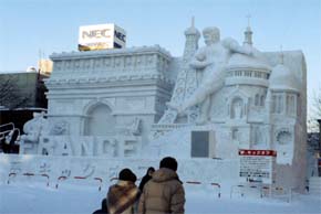 W杯フランス大会の大雪像。サッカー選手とともに、凱旋門とエッフェル塔があります。W杯の大雪像なのに、左隅にはドーレ君が。ドーレ君の部分だけの拡大像はこちら。
