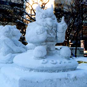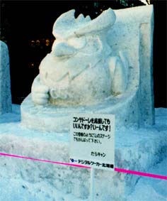 市民雪像などの傾向を見ると、一番人気は、アニメキャラクターのピカチュウ、昨年一番人気のマキバオーは一体も無し。また、例年、数体は必ずあるプロ野球の巨人関係の雪像が一体もなかった、という珍しいこともおきました。その分をサッカーが取ったということでしょうか。