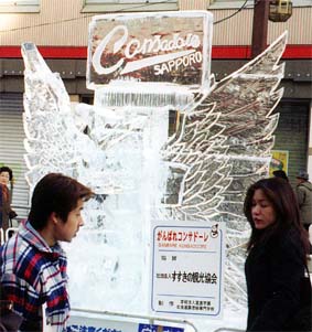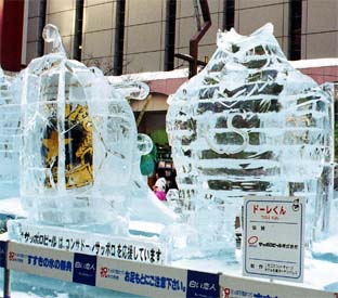 こちらは、雪まつりと同時にススキノで行われている『第18回氷の祭典』。調理師の皆さんが、包丁をノミにもちかえ制作した氷像が90基。その中には、ドーレくんの氷像も見られました。協賛が、サッポロビールというのもいいですね。