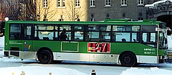 市バスの横には、コンサドーレの看板が。小さいけどわかりますか。赤と黒の看板です。札幌市の国民年金に入りましょう、という看板ですが、コンサドーレ札幌のロゴもちゃんと入っています。