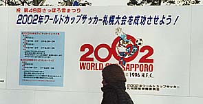 2002年W杯日韓大会の札幌開催を成功させようという広告看板。札幌会場の広告には、2002の数字の中にドーレくんがいます。