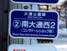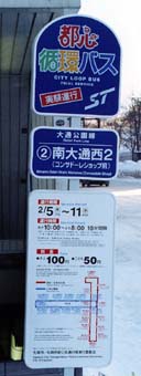 札幌中心部の交通量を少なくするために実験的に運行されている都心循環バスの臨時バス停。今回は、雪まつりの期間中運行しています。大通に面するコンサグッズショップの前のバス停の名前には、『コンサドーレショップ前』。バス停の名称部分だけの拡大像は右側。