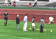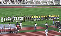 とか何とかするうちに、試合開始。試合に先立ち、偉い人達の挨拶があり(さっさと話さばいいのに、これが長い)、始球式も行われました。始球式には、かつて清水エスパルスに在籍したシジマールさんがいました。シジマールさん、どうやら現役引退してコーチ業のようなことやっているみたいです。今回もブラジル(U-16)代表と一緒に来日して、各地で行われているサッカー教室のコーチをしているみたい。