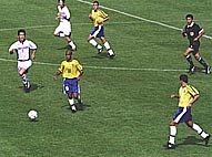 ブラジルユースの一方的な展開になるかと思えば、あにはからんや、試合になっている。ブラジルユースは4-4-2、北海道選抜は3-5-2。開始しばらくは両チームとも、様子見なのか、ジャブの撃ち合い。試合が動いたのは、点が入らないため、ブラジルの選手がカリカリし始めた前半22分。右サイドをきれいに破られ、逆サイドへ上がったセンタリングに、ブラジルフォワードがヘッドで合わせる。0-1、先制点をあげた。これで、ブラジルは吹っ切れたのか、3分後、追加点をあげる。左サイドから崩され、ペナルティエリアのすぐ外辺りに、ゆるゆると流れたボールを、ミドルシュート。GKかろうじて触れるもそのまま、ゴールの中へ。これで、0-2、だんだん地力の差がでてきたか。