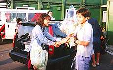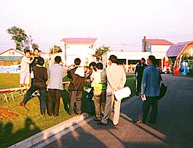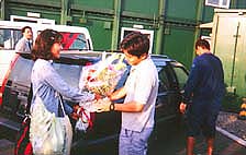 代表候補選出を祝って、ファンから花束を贈られる吉原宏太選手。後ろの紺のシャツを着ているのは、大野貴史選手。念願の五輪出場への一歩を踏み出した吉原選手は笑顔笑顔。一方、大野選手は、この日候補選手の発表があることすら知らなかったそうで、自分の名前があったことに、とにかく驚いたそうです。(写真:谷口恭さん)
