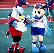 コンサドーレのマスコット、ドーレくんと手を取り合うとびまる君。