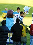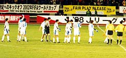 試合終了後、アウェイ側(フリエ側)ゴール裏席前を歩く選手達。コンサドーレコールとフリューゲルスコールが交互に行われる中、BGMには、フリエクラブソング「ビクトリー」も流れされました。