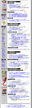 これが九代目、現在のデザインです。ホームページの名称とURLの変更といった大リニューアルにともない、デザインを一新(したつもり)。赤と黒を基本に、新ロゴ、トレードマークを全面に出したレイアウトです。ページ全体をテーブルタグにより分割。左端にサイトのコンテンツが目次のように入りました。また、ページ全体の縦の長さを少しでも短くするために、ページ下部にあった、伝統的な楕円形のボタンがなくなりました。2001年もこのデザインで行く予定なので、初めて2年間もったトッページデザインとなるかも。