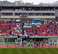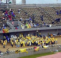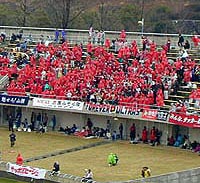 乗客の中に乗り遅れた輩がいたようで人数確認などで時間を食い結局高知空港には25分遅れで到着。ツアーで来ていたので貸切バスで春野へ向かったが手前2Kで渋滞。時間は経過するが、バスは一向に進まない。車内では先着しているサポーターに携帯で連絡するものが多数いた。皆一様に「間にあいそうに無い・・・・」と口々に話す。そんな重苦しい雰囲気の中で春野へ到着。すぐに競技場へ向かったがメインの方から歩いて行った瞬間、選手入場のあの曲が流れてきた。そう、厚別で聞きなれたあの曲だ。そうなれば歩いてなんかいられない。ダッシュだ~~~!!!