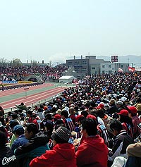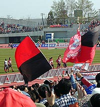 万が一のことを考えて前日にどうにかS指定席を用意していたので、「もしゴール裏が無理ならばこちらにしよう」と決めていた。いざ開場していってみると案の定、貼るスペースなどまったくなくて横断幕はメインのゴールよりの所でのぼりはメインのアウェイ寄りの所で落ち着いた。この作業のせいで朝食の定番である「必勝弁当」が買えなかった。仕方が無くお菓子でしのぐ羽目になってしまった。