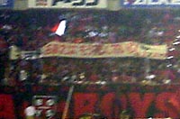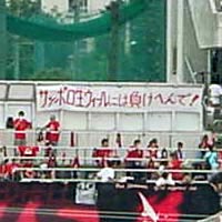 | サッポロ生ウィル弾幕。「サッポロ生ウィルには負けへんで~」それはそれでいいんだけど、さいたまの チームでなぜ関西弁になる??? | 洋平おまえはもう死んでいる弾幕。去年から見たものだが、“by エメルソン”はないでしょう。。。トゥットもし くは小野にしなさい(笑) |