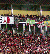 夏には「やっぱりサッカーは空の下でやるもんだよな」などと御託を並べていた僕も友人たちも、本格的な冬を前にドームの屋根に感謝しながらのサッカー観戦となる。来年のW杯の頃には、またバカな僕たちは「こんないい季節にどーして屋根の下で・・・」などと言い出すのだろうけど、今の時期、見る方もやる方もこのでかい屋根に感謝するしかない。