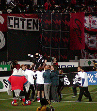 | 試合後、挨拶する岡田監督 | ホーム側ゴール裏で行なわれた岡田監督の胴上げ |