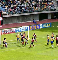 前半6分、左サイドの曽田が手を上げてオフサイドをアピールするも認められず、光岡に裏をとられる。曽田が光岡を後ろから引っ張り倒して仙台のフリーキック。蹴るのはもちろん岩本輝雄。左足からきれいな弾道がゴール前へと描かれるが、佐藤洋平がパンチングでクリア。結果的にはどうってことないボールだったが、それでも、こういう武器を持っているだけで、守る側にとっては脅威に感じる(うらやましい(^^;))。