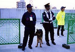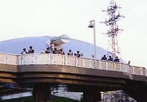札幌ドーム前の交差点にある歩道橋の上から指揮する機動隊