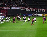 14:04キックオフ。浦和サポーターの「WE ARE REDS!」コールがまるで怒号のように聞こえ、ものすごいプレッシャーを感じる。近くで見ていても全体的にまとまっている印象を受ける。