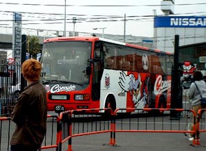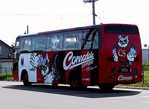 おそらくコンサドーレをペインティングした各種車両の中では一番みんなに知られているであろうコンサドーレバス。このバスは、以前ニュースのページでも紹介したように2000年秋に登場し現在に至ります。コンサドーレのクラブスポンサーであるJR北海道バスが用意したもので、コンサ初のクラブ専用バスとなりました。ちなみに今季からユニフォームパンツの裾のスポンサーになったJR北海道と、このJR北海道バスはグループ系企業ではありますが、それぞれ独立した会社となっています。すなわち2社ともスポンサーになってくれているわけです。しかもJR北海道はJR北海道でコンサドーレのペインティング列車を制作しちゃったりしてくれています。