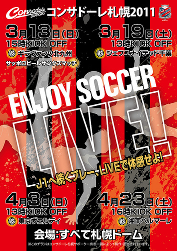 サポーター有志により結成された札幌赤黒連盟が作成・配布しているホームゲーム告知ちらし、2011年シーズン分が出ました(February 28 2011刊)。