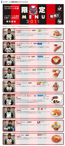 札幌ドーム公式サイトで、シーズン開幕前に発表された2011年シーズンの「コンサドーレ札幌戦限定スタジアムグルメ」の紹介ページが更新されていて、各メニューをコンサ選手が紹介しています。掲載メニューは、札幌ドーム内のテナント店舗提供の限定グルメです。まもなく、Jリーグ再開です。