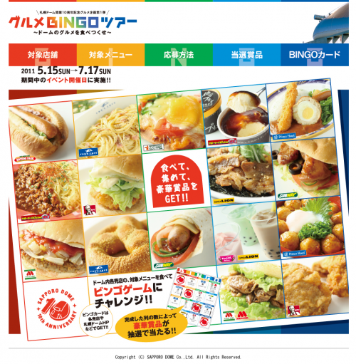 札幌ドーム公式サイトで、5/15から札幌ドームのグルメBINGOツアーが開催される。