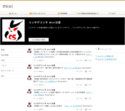 mixiにはコミュニティが既にあるので、どういう風に運用するかまだ決めておりません。現在は、Twitterに投稿したコンサデコンサの記事案内を自動投稿しています。