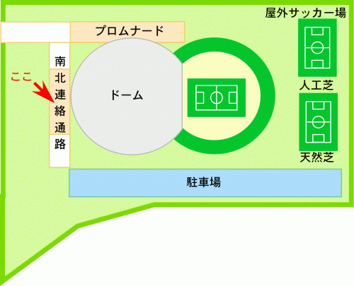 南北連絡通路は下記のところ。試合のついでに行く人は、スタジアムに入ってしまうと行けません。