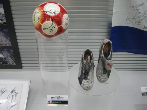 ドームでのコンサドーレの初ゴールを決めた播戸選手のスパイクと記念ボール。