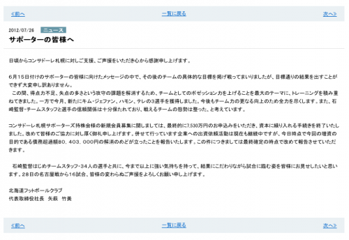 北海道フットボールクラブの矢萩竹美社長のサポーターへのメッセージがふたたびコンサドーレ札幌の公式サイトに掲載された。