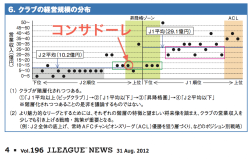 その中で興味を引くのは、営業収入と順位を並べたグラフ。4ページから引用したものに、赤色でコンサドーレを指し示す矢印などを書き足して下記に表示。