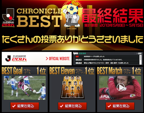 Jリーグの20周年を記念して、『Jクロニクルベスト』(Jクロ)サイトにて行われていた『ベストゴール』『ベストイレブン』『ベストマッチ』投票の最終結果が発表された。 Jクロでは、この20年間の3部門を決定するサポーターによ … 続きを読む 中山雅史氏が『Jクロニクルベスト』でベストイレブンに