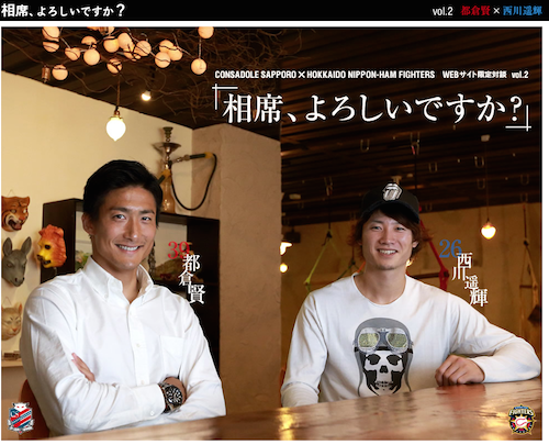 「相席、よろしいですか?」は、今シーズン5月から始まったWebサイト限定企画。両チームから選手やスタッフが参加して対談を行う。第2回は、コンサドーレ札幌から都倉賢選手、北海道日本ハムファイターズからは西川遥輝選手が出席しての対談。
