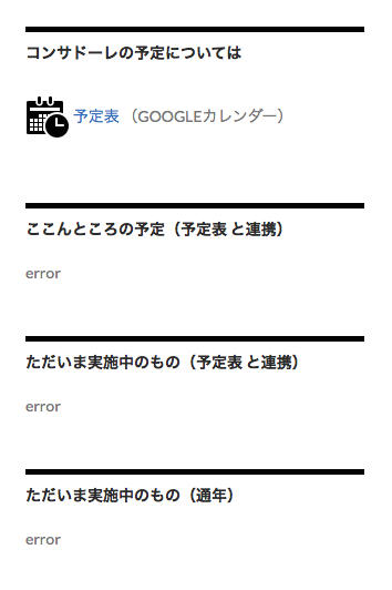 予定表ページのGoogleカレンダー自体はちゃんと表示されているので、予定を確認したい方は予定表ページで確認下さい。